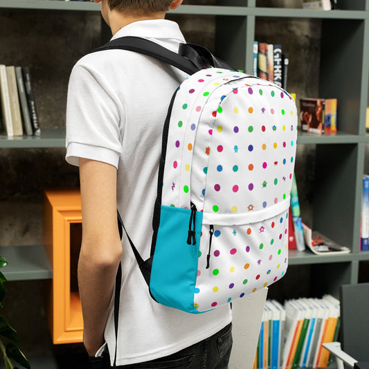Backpack White Turquoise Small Dot Monsters (includes front pocket)